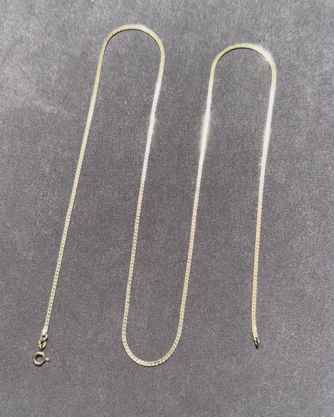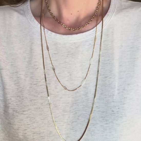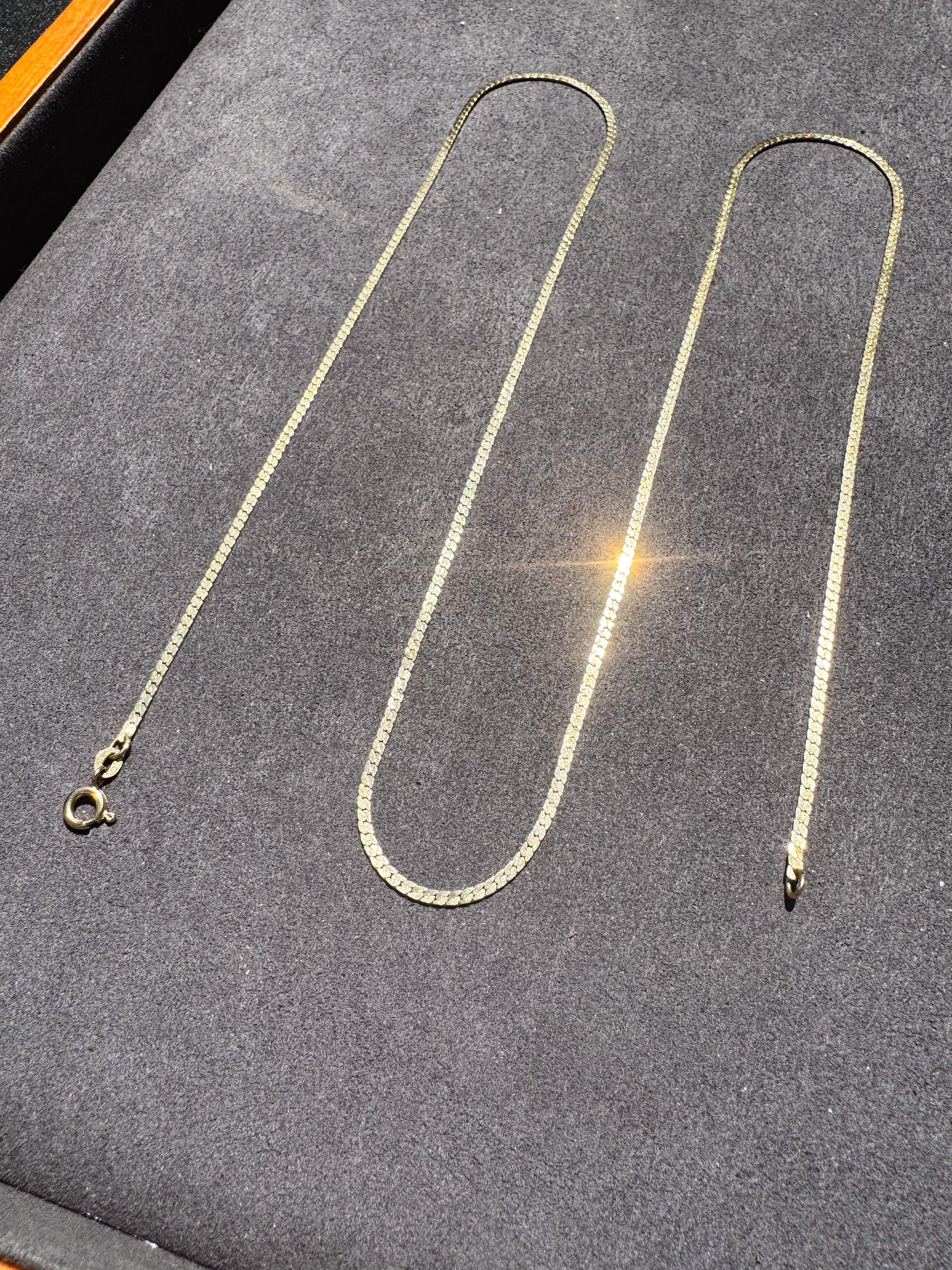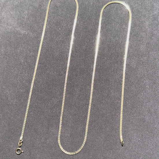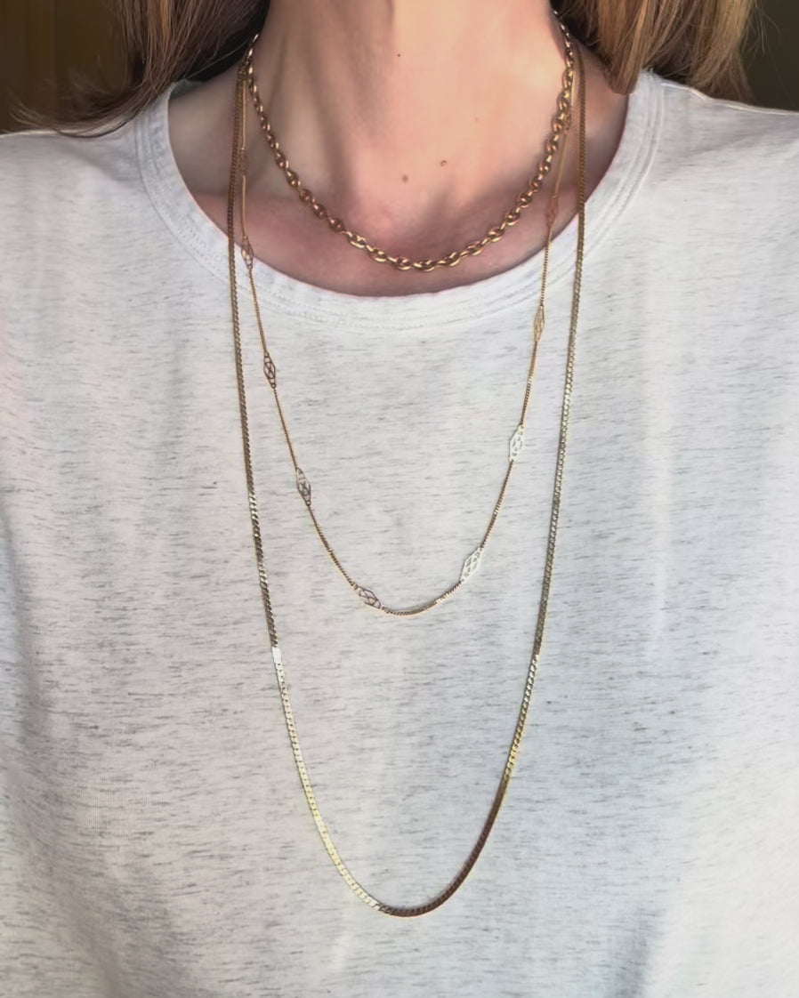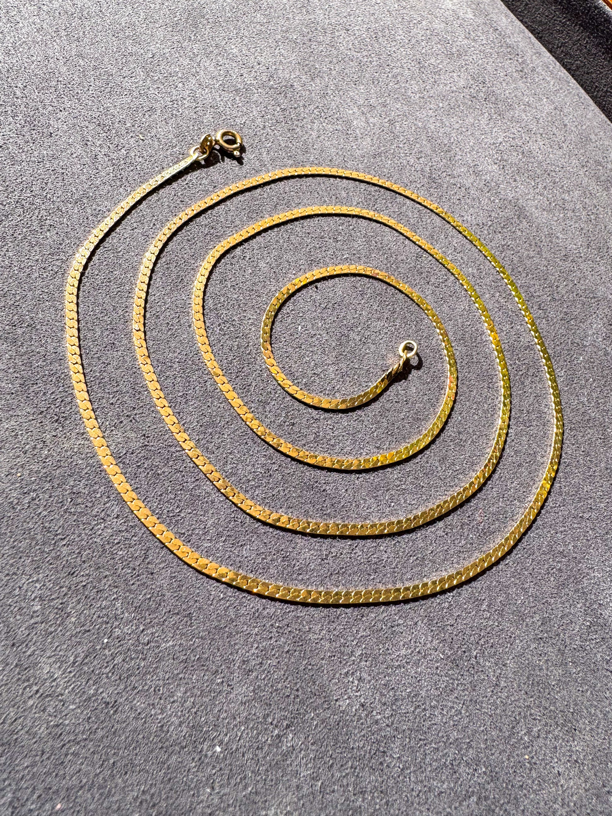 It’s rare to find a chain like this in such a long length, and this one is a stunner. A traditional high polish flat link chain, this 14K yellow gold, 30 inch beauty lays gracefully on the neck. It’s worth noting that these chains are delicate, so it is not recommended to add any pendants or charms. This chain, from the 1980s, has survived remarkably well. It has one tiny kink that is barely visible to the eye (see photos), but can ever so slightly be felt as you run your fingers down the necklace. It is priced accordingly (AT MELT VALUE). These chains can pull a pretty penny, so this is your chance to snap one up at a great price! Details below.