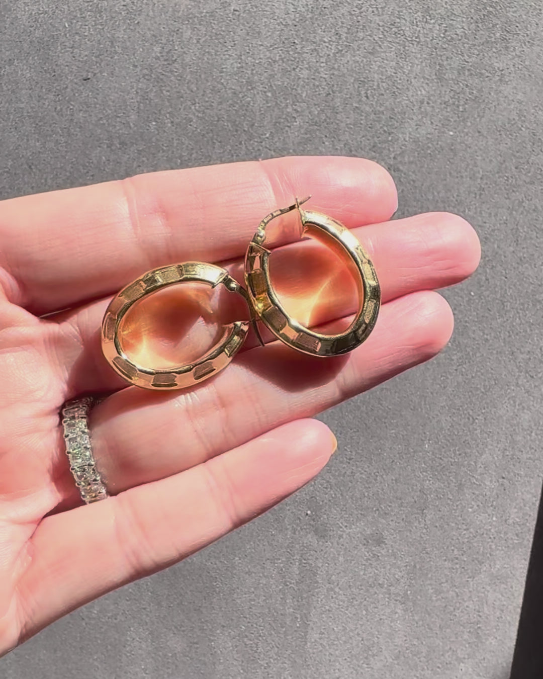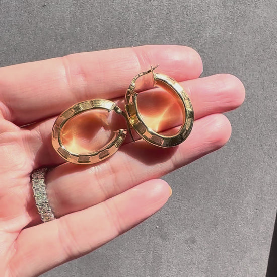 A twist on a classic silhouette, these 14K yellow gold hoops feature a funky checker pattern that alternates between polished and matte. Made in Italy, these are great statement hoops. Details below.