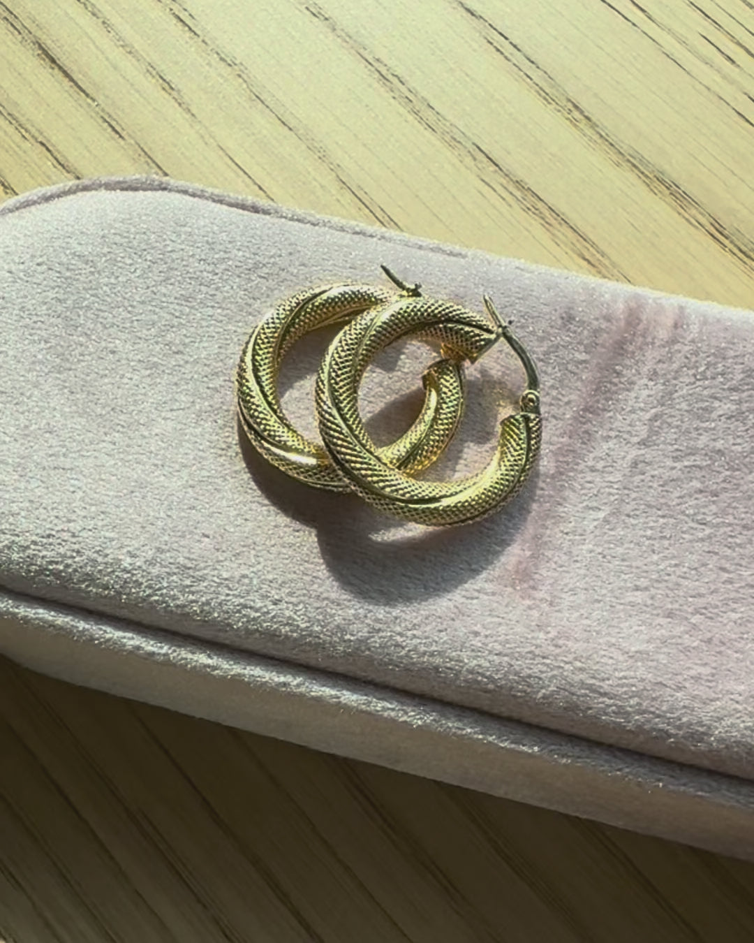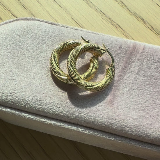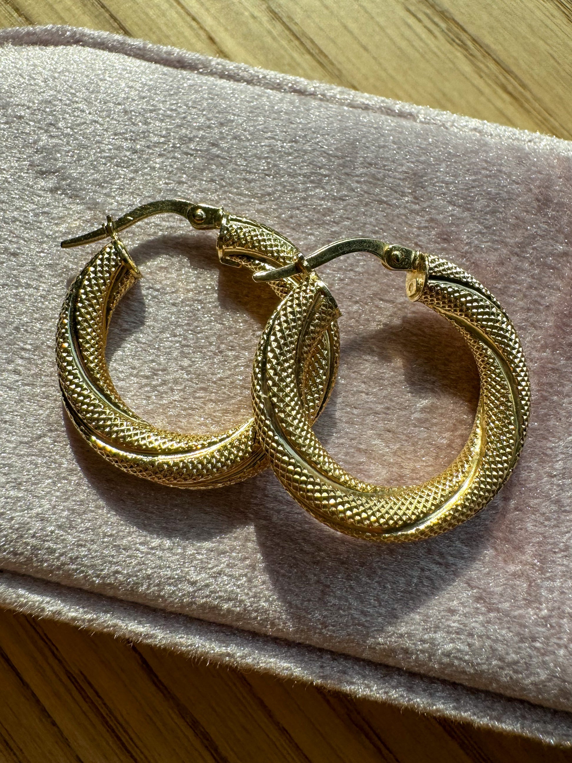 Simply stunning, these textured, twisted hoops were made and patented by famed Italian jewelry house Unoaerre. They’re 14K yellow gold, fully hallmarked and look to be never worn.