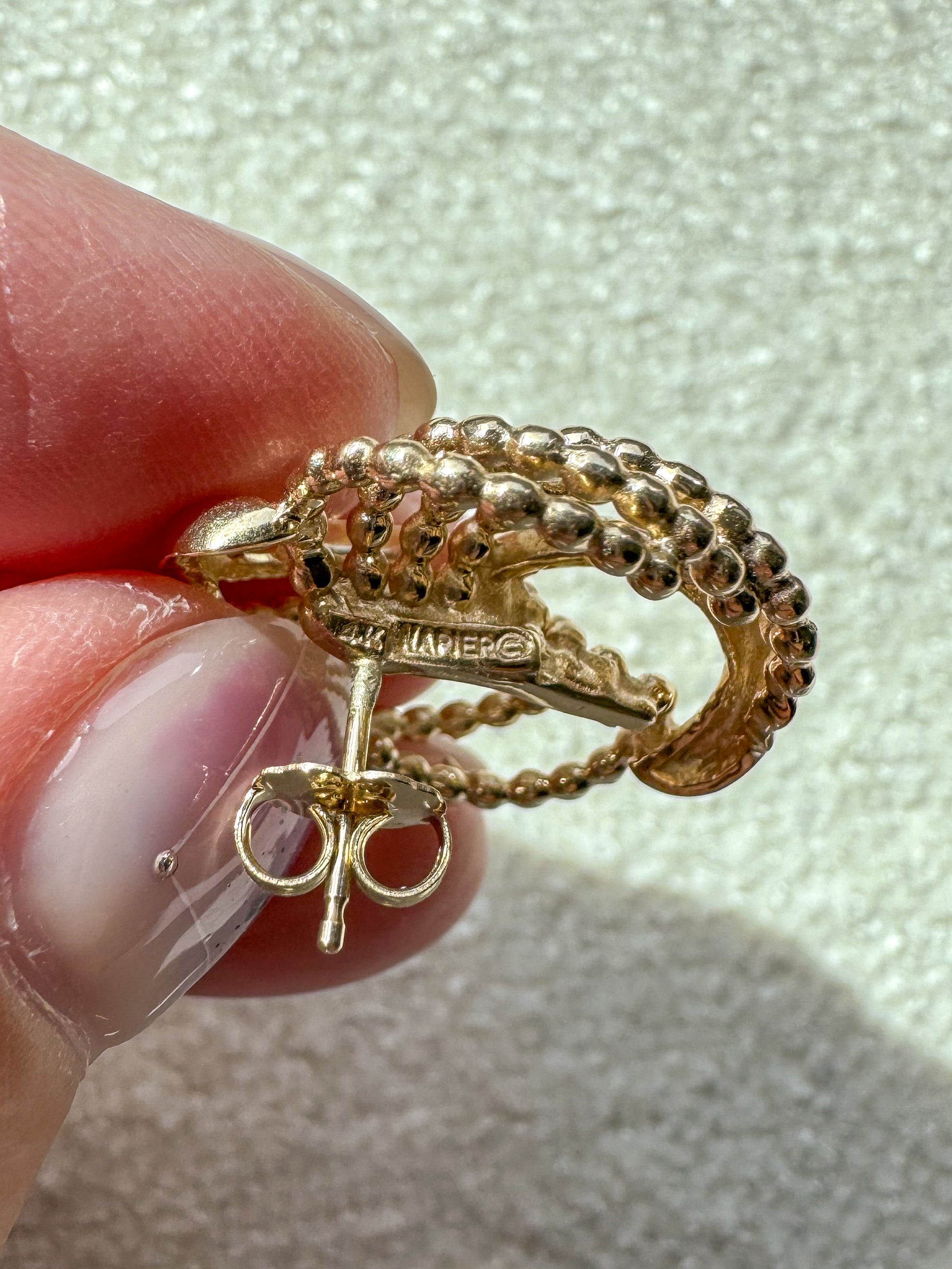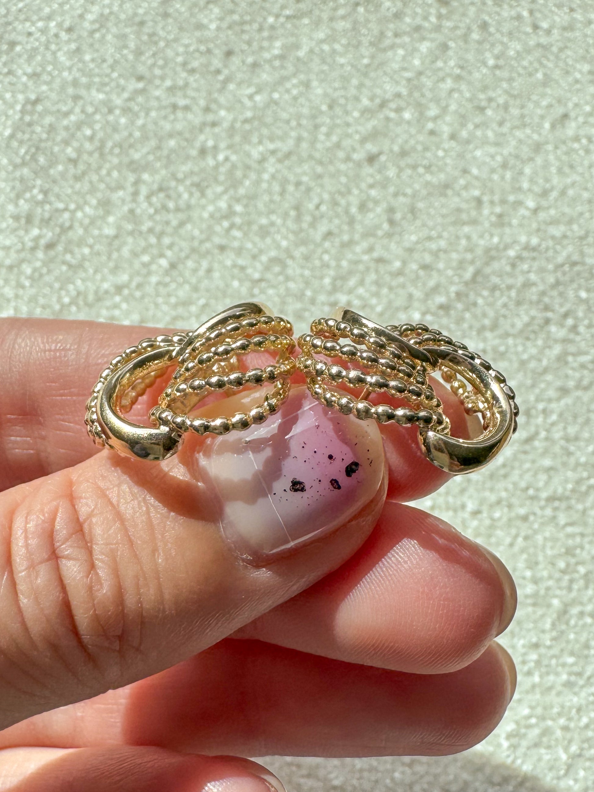 These earrings are my favorite conversion to date! Hefty and sculptural, these vintage statement earrings are crafted from solid 14K yellow gold. Originally with screw backs (or as my jeweler lovingly calls them “antique torture devices”), we converted these to standard posts, with large backs to keep them in place. Part door-knocker, part love knot and entirely fabulous. DM to claim or with questions!