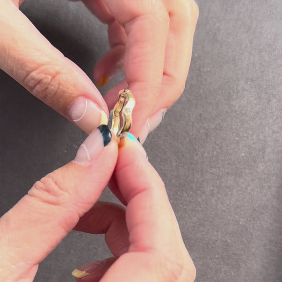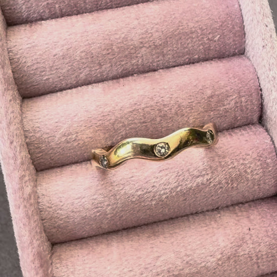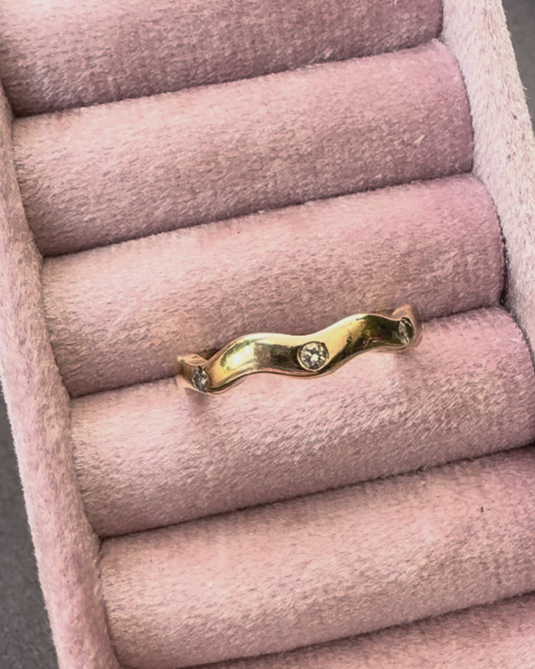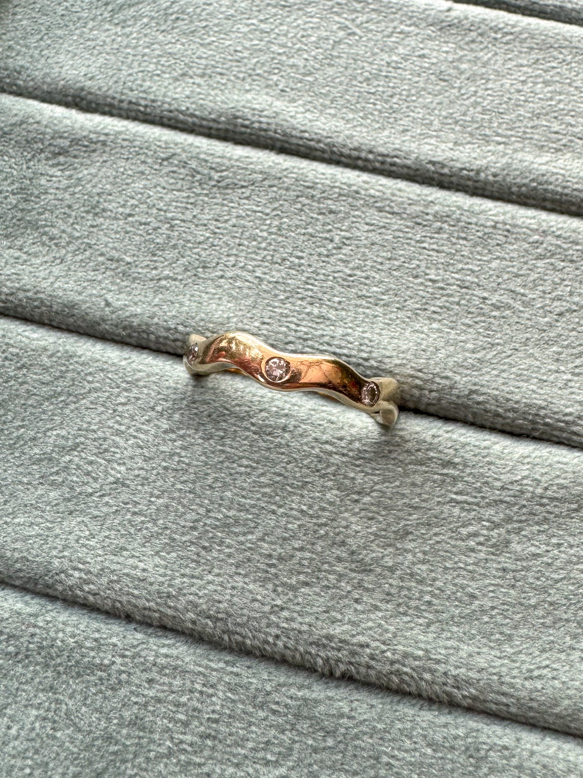 This wavy ring gives off all the good vibes. Solid 14K yellow gold, with three small diamonds, this adorable ring looks great on its own, but would also add the perfect punch to your summer ring stack. Details below.
