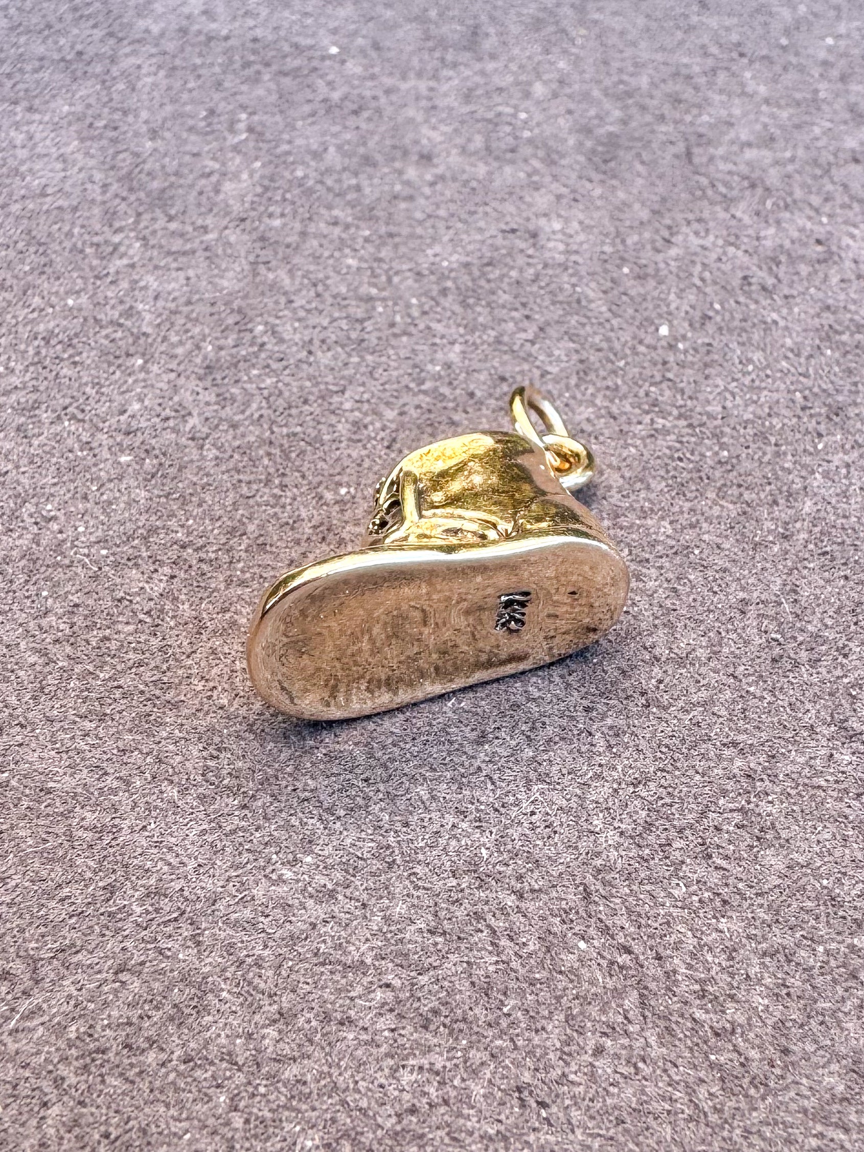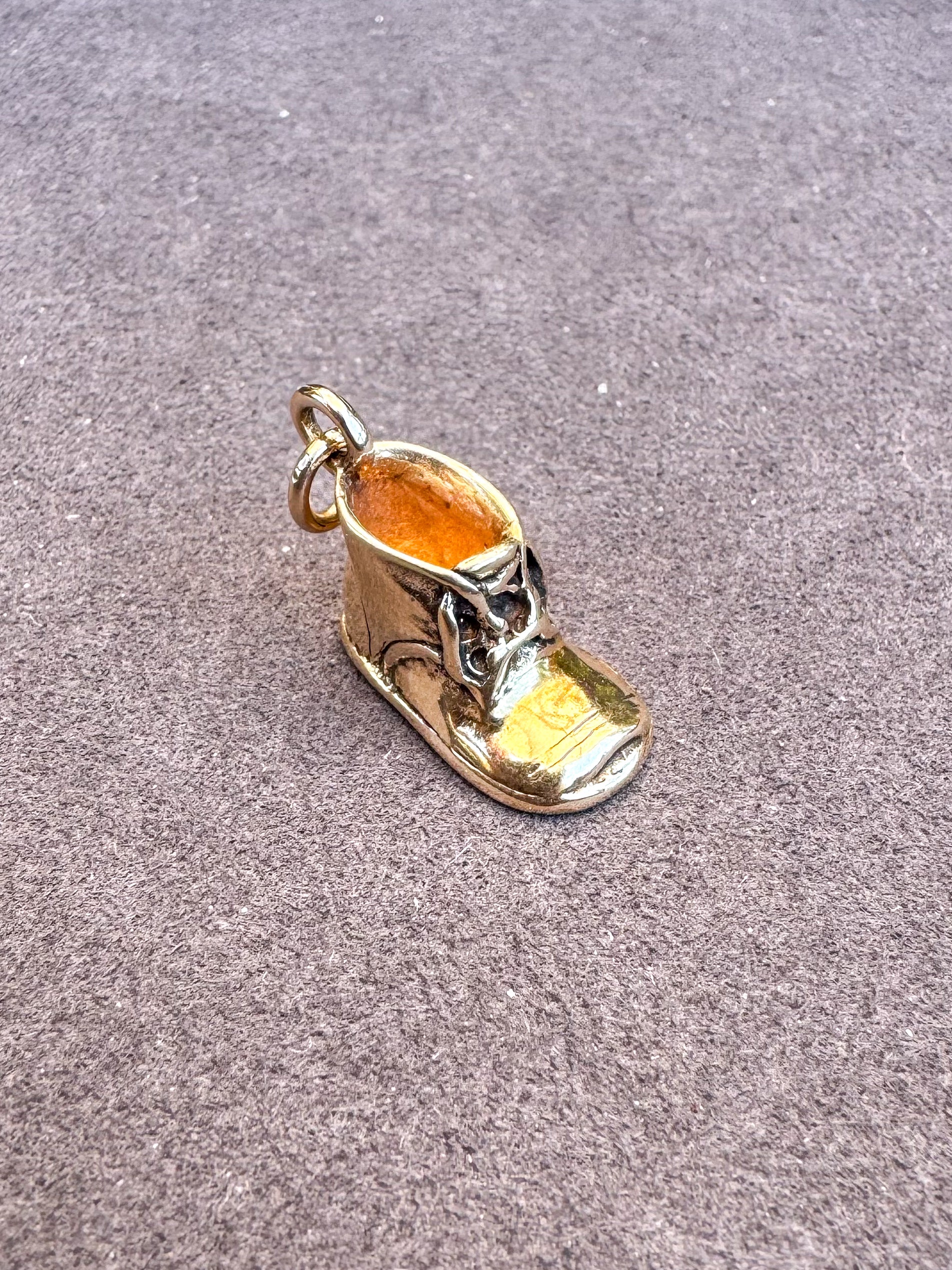 Solid and fully 3D baby shoe or laced boot charm. Crafted in 14K yellow gold and includes a 14K jump ring. Would be a lovely gift for a mama-to-be!