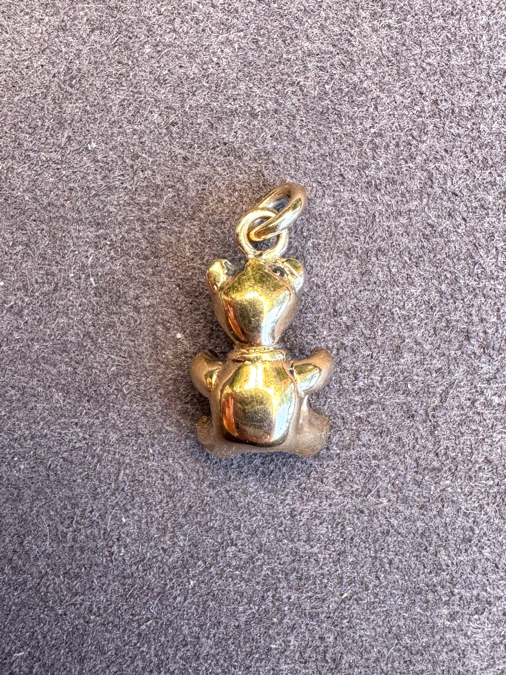 Solid, fully three-dimensional 14K yellow gold vintage teddy bear wearing a bow. Not marked but tested for 14K purity. Includes 14K jump ring.