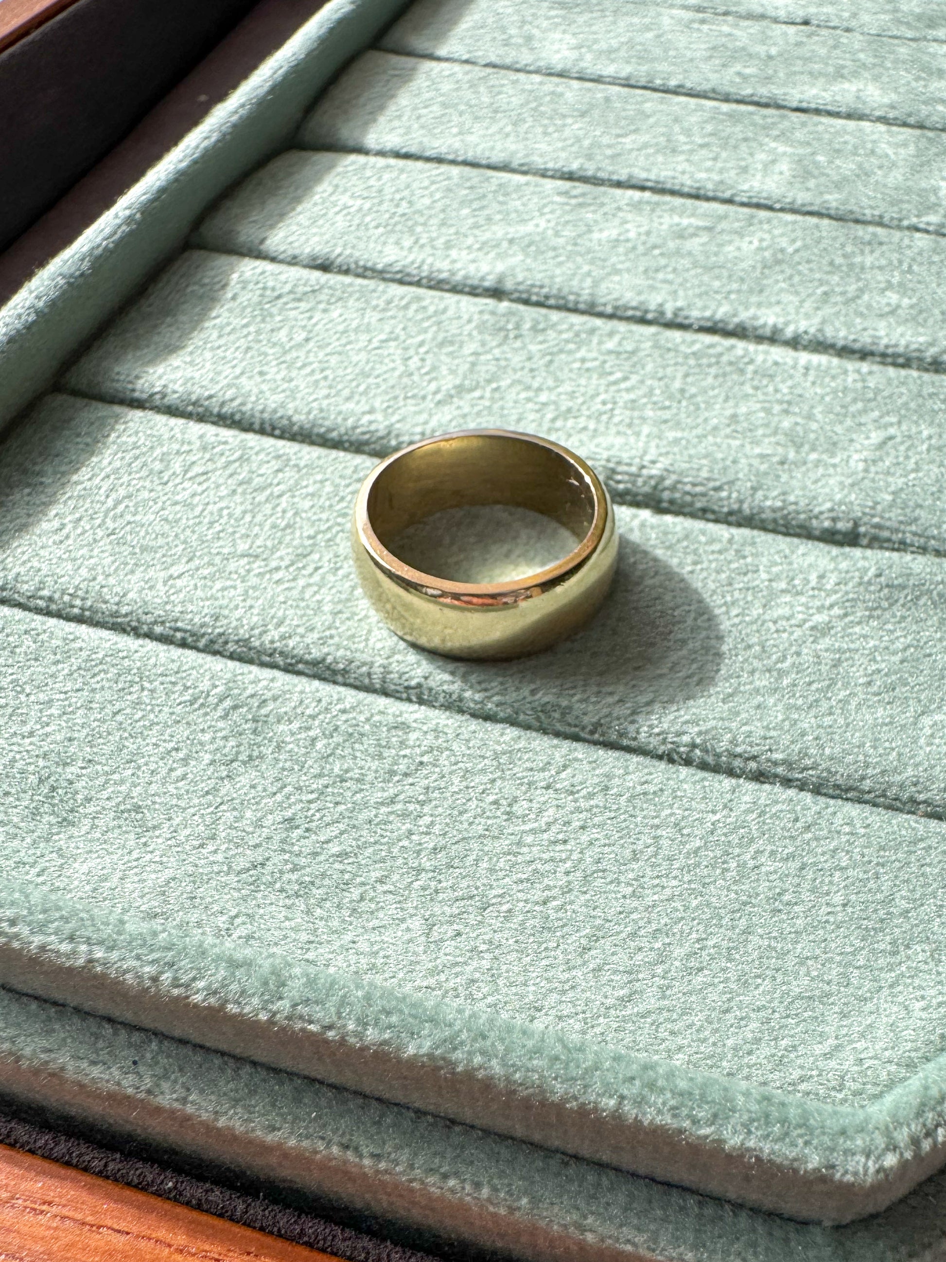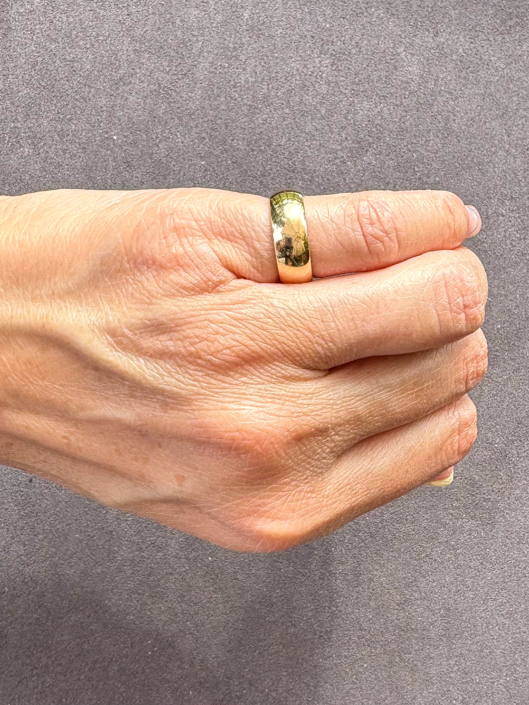 A classic cigar band is a jewelry box staple, and it doesn’t get any better than this one – simple 14K yellow gold, completely solid and just the right width. This workhorse piece is incredibly well made, and will be enjoyed for decades (if not centuries) to come. Yes, it’s that good. Details below.