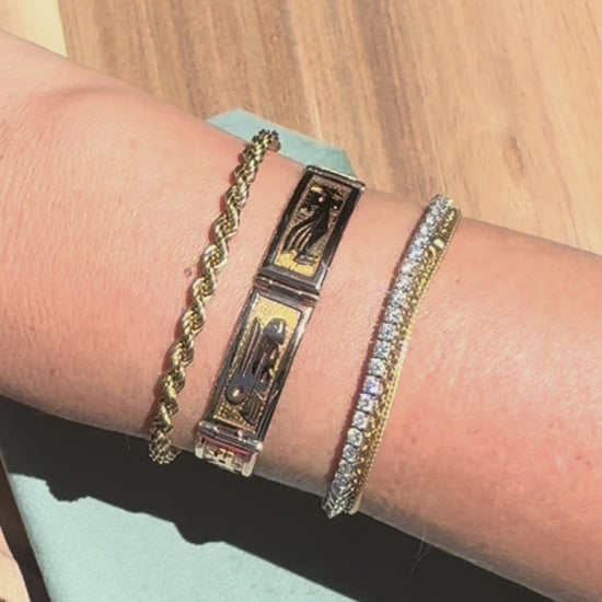 Punching well above its weight class, this classic 14K yellow gold rope chain bracelet is the definition of versatile. It adds some extra oomph to any wrist stack or it can be paired with another chain to be styled as a necklace (my favorite look so far is as a choker). Oh, and the patina is perfect. Scoop this one up, you won’t be sorry. Details below.