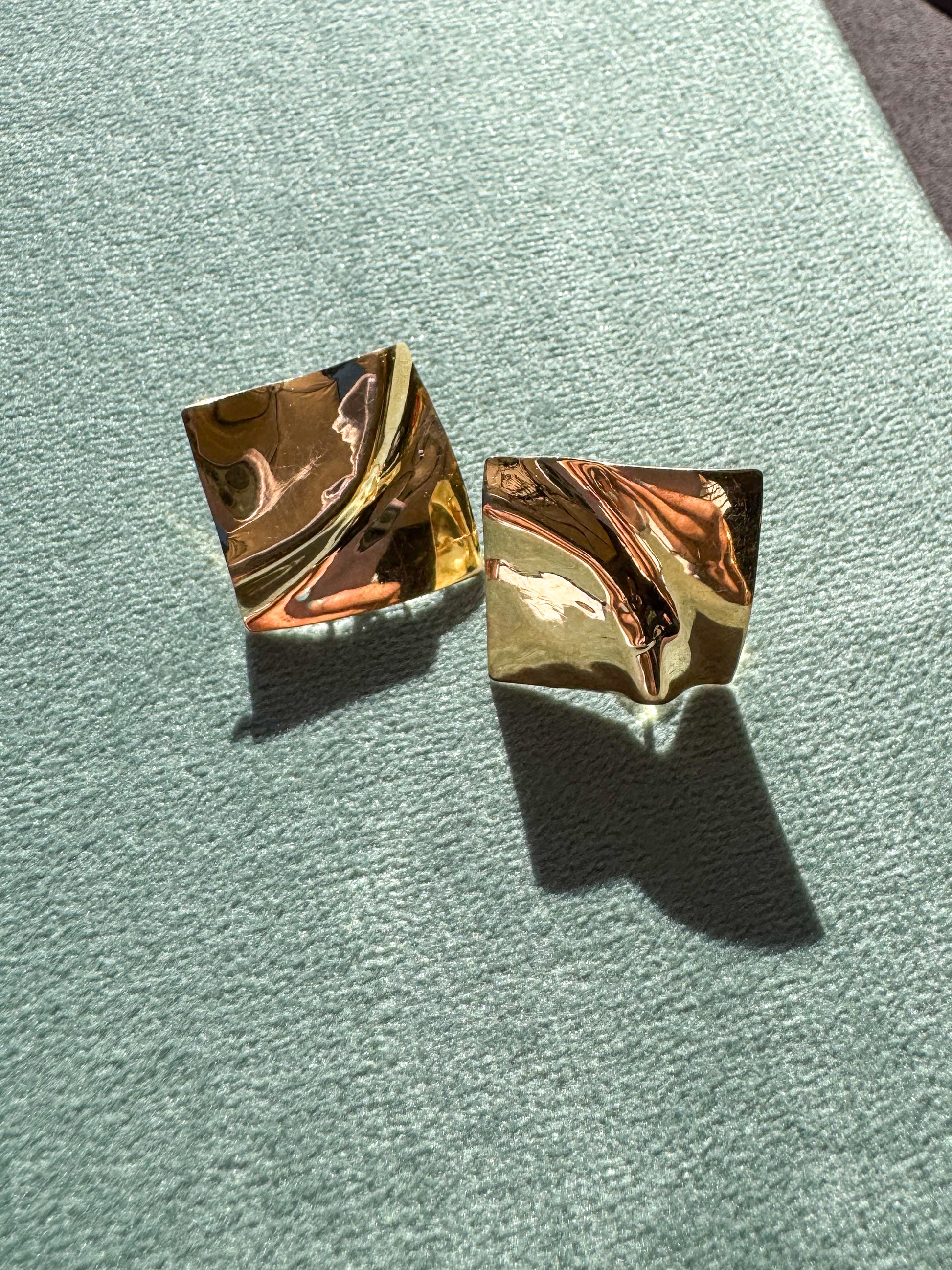 Paper thin and crinkled to catch the light just so, these retro 14K yellow gold earrings make a HUGE impact. Light as air, with a comfortable post back, these are begging to be the star of your next dressy outfit (imagine these with a little black dress and a slicked back bun – can you even?!). So unique, I’ve never seen another pair like them. One earring has two tiny dents in the center, which while semi-visible, really just look like part of the organic crinkle pattern. Nonetheless, these are priced accordingly. Full details below! DM to claim or with additional questions!