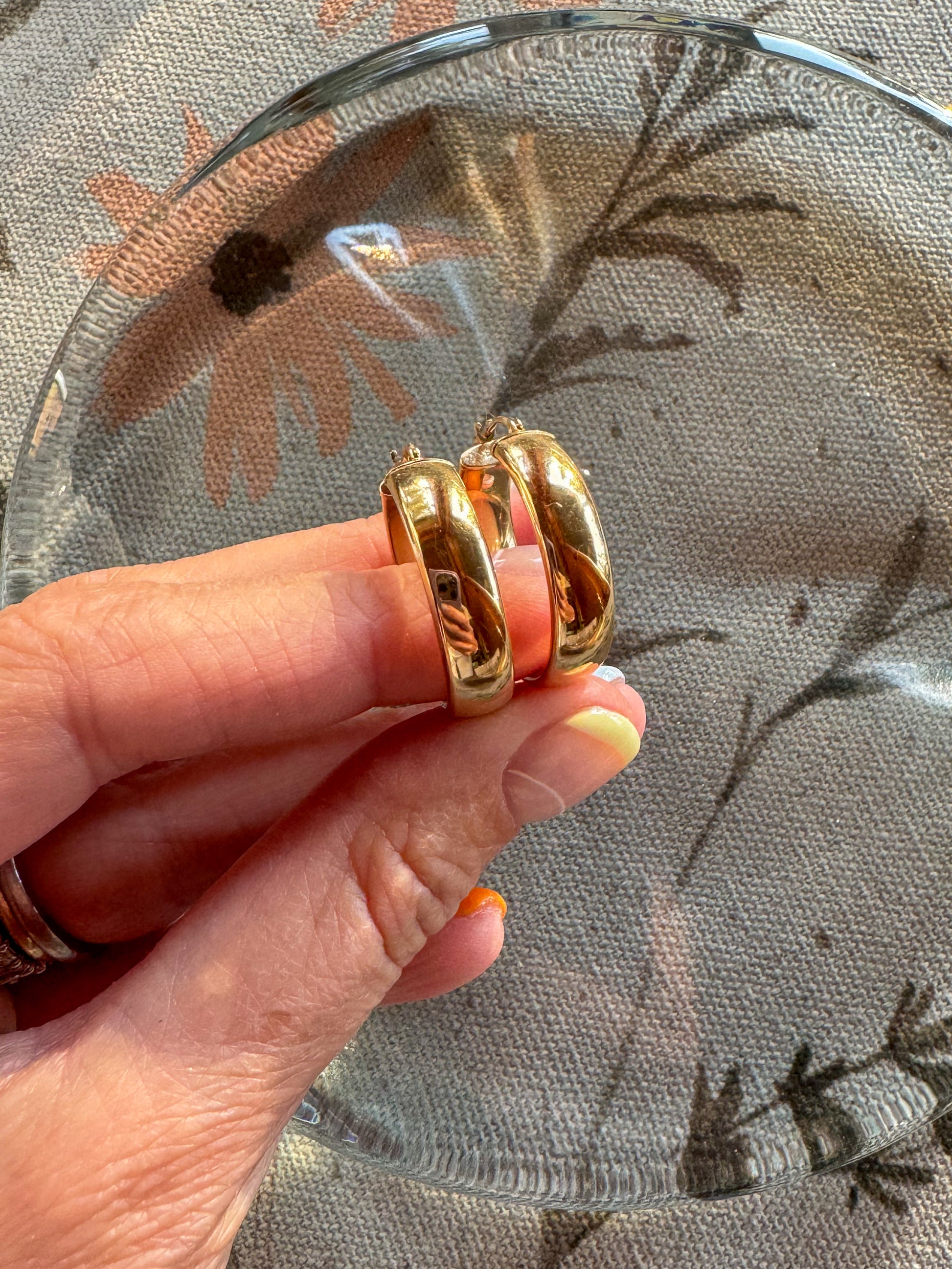 The perfect pair of classic hoops! These chunky 14K yellow gold hoop earrings make a big statement and thanks to their hollow construction and latch closure, they're ultra comfortable and light on the ear. A great silhouette for every day, they can easily adapt from running errands, to the office, to a night on the town. More information below.