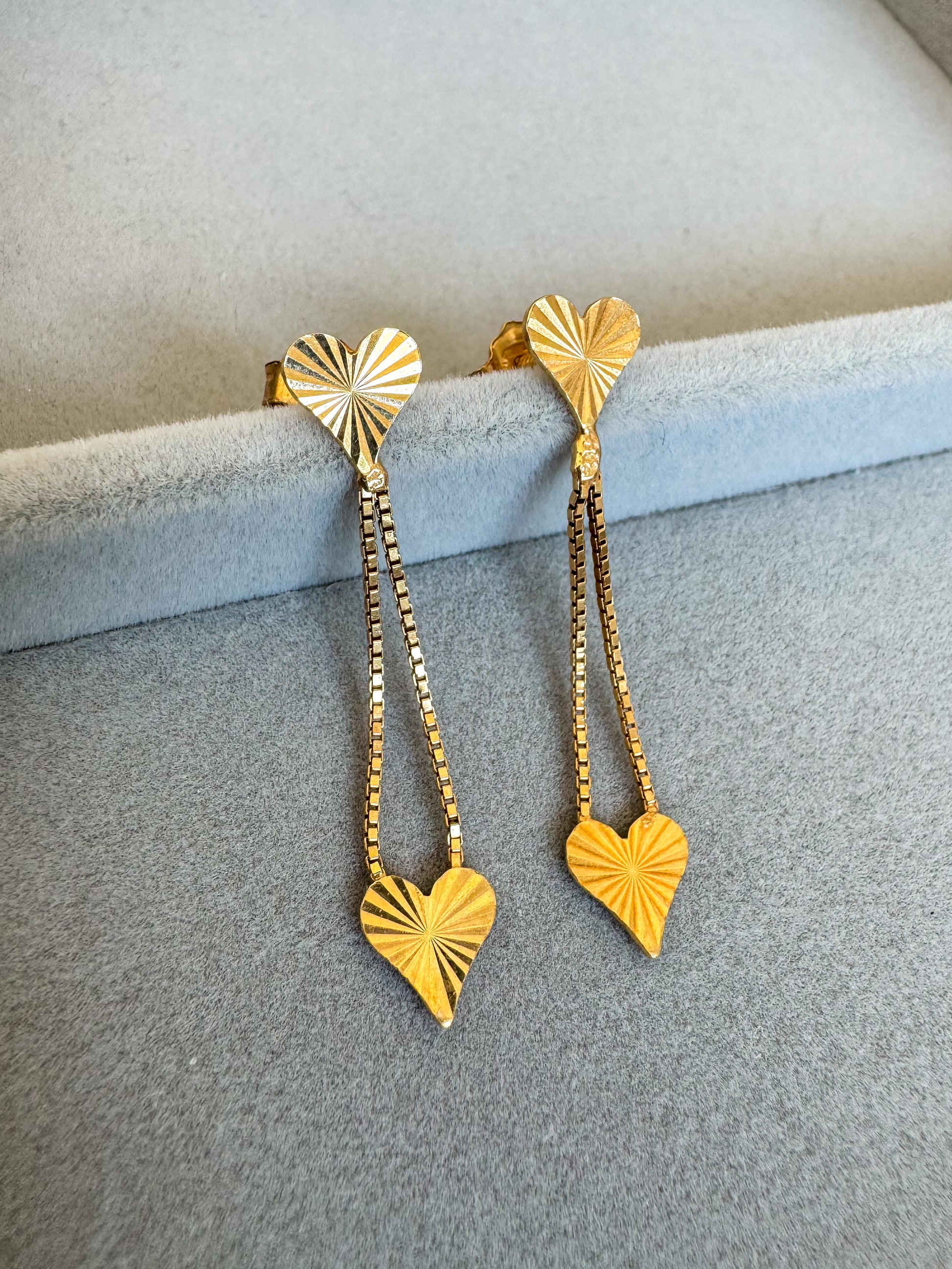 Vintage 18K Engine Turned Heart Dangle Earrings