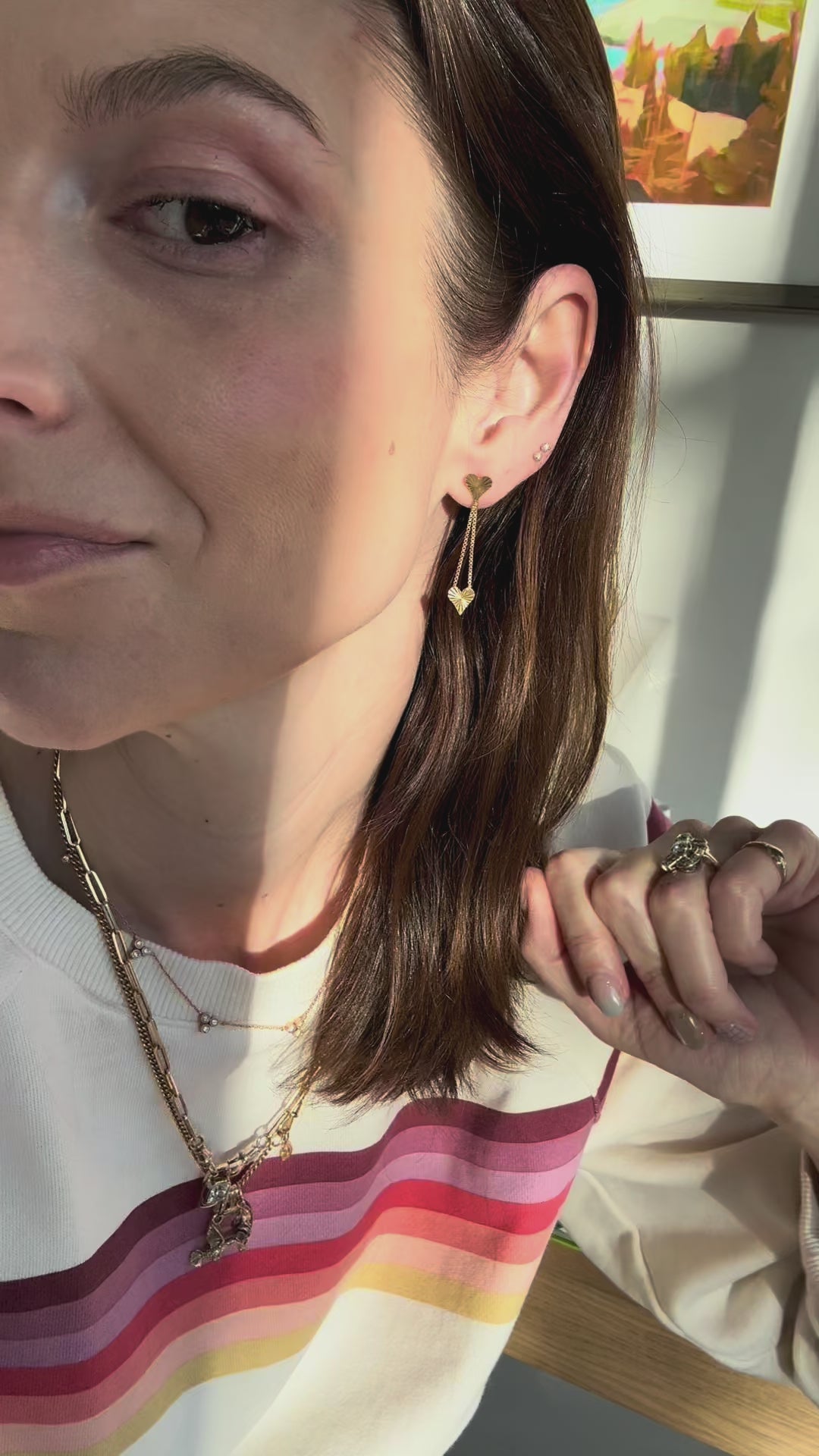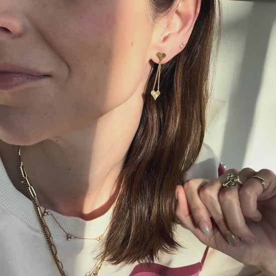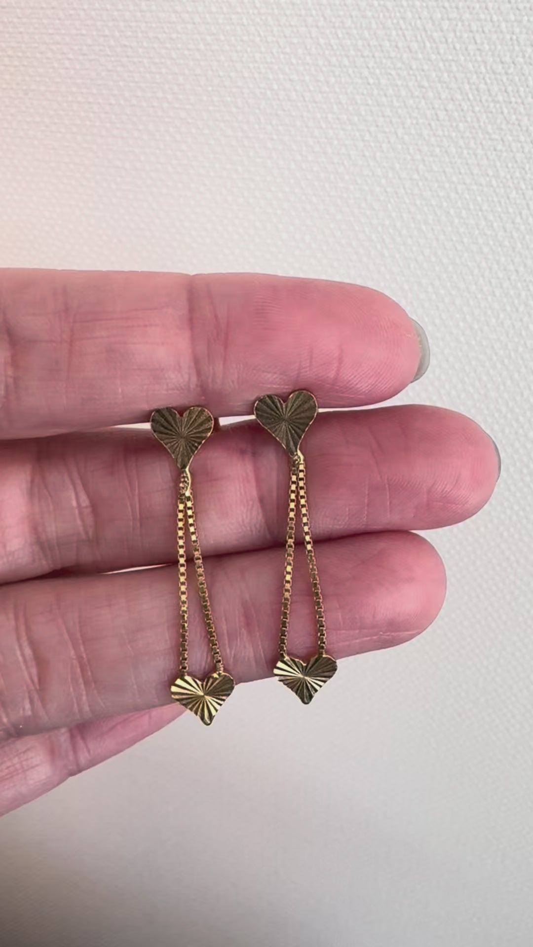 The details on these earrings are immaculate. Crafted from 18K yellow gold, they feature engine turned hearts, connected by sturdy box chain, with thick, high quality posts. Each earring comes with a matching 18K earring back.