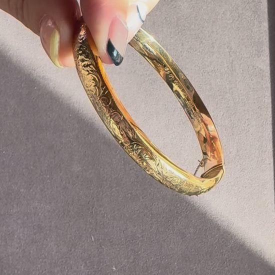 The outside front and back of the bracelet are engraved in an all-over floral/scroll motif, and a sweet personalized engraving on the inside reads "Karen from Grandma June 1966". The bracelet is an oval shape, with a perfectly functioning hinge and snap closure and safety chain. This piece is stunning on its own, or will make a bold statement as part of an arm stack. See below for additional details.